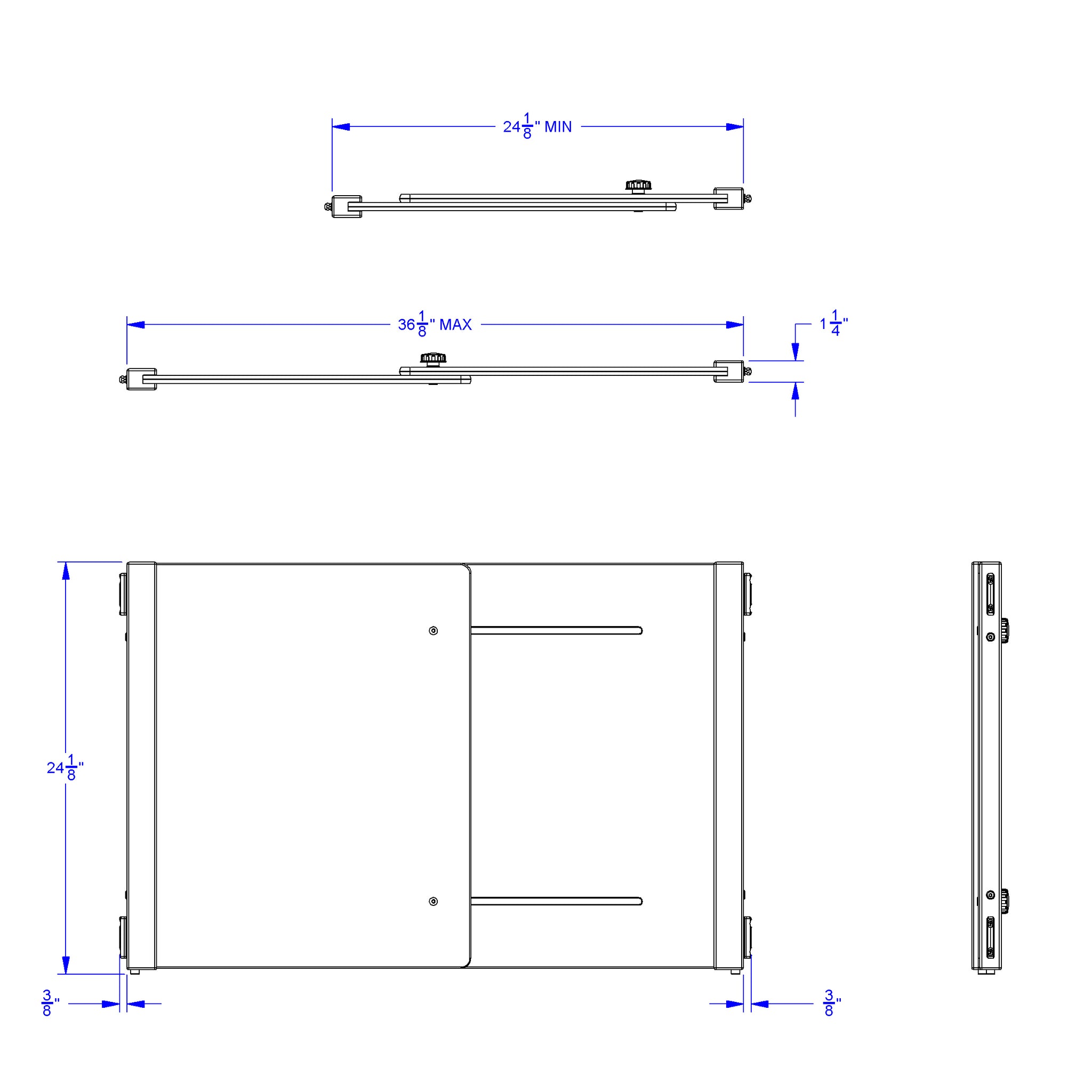 Use KYDZ Suite® Accordion Panel to span unique spaces not covered by traditional sized KYDZ Suite® Panels. Loosen knob to expand panel from 24" all the way to 36" or anywhere in-between. Tighten knob to secure in place. Knob placed on outside to prevent children from reaching. No tools needed for adjustments. Dual-sided, KYDZTuff® finished Baltic-Birch plywood surface. Connect to T-Height Hubs (24.5" high).