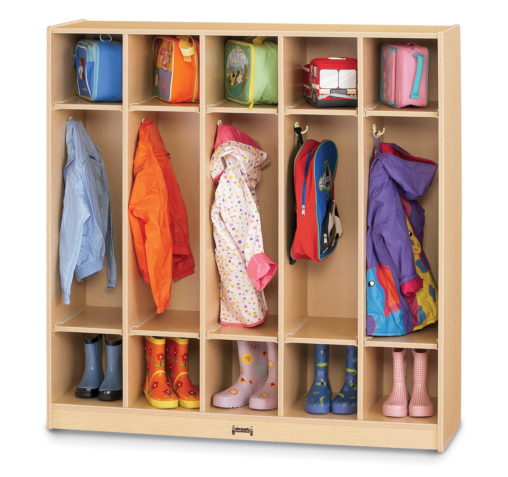 Hang jackets and backpacks on the two double coat lockers in each section. Upper and lower shelves provide additional space for boots and lunch boxes.