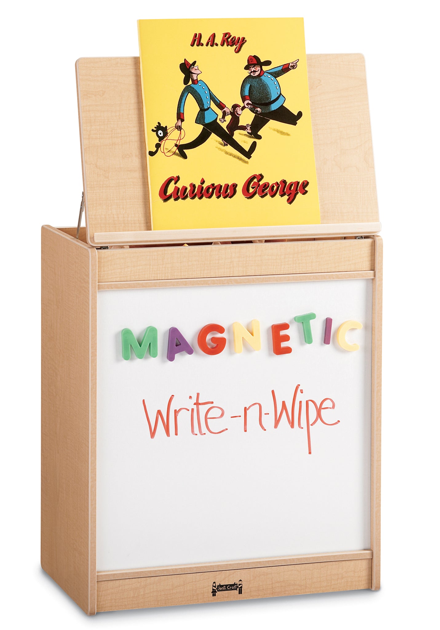 Add to your big book story with this easel featuring a Magnetic Write-n-Wipe panel below book display. Vertical big book partitions in back for storing a variety of books. Folding display easel hides storage compartment. Easel opens to 43" high.