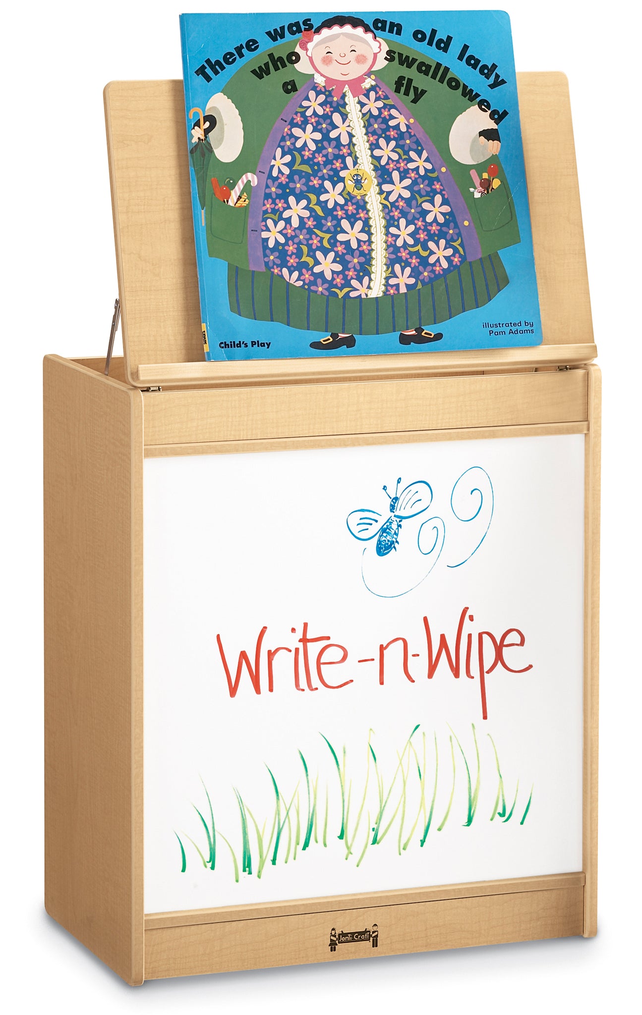Add to your big book story with this easel featuring a Write-n-Wipe panel below book display. Vertical big book partitions in back for storing a variety of books. Folding display easel hides storage compartment. Easel opens to 43" high.