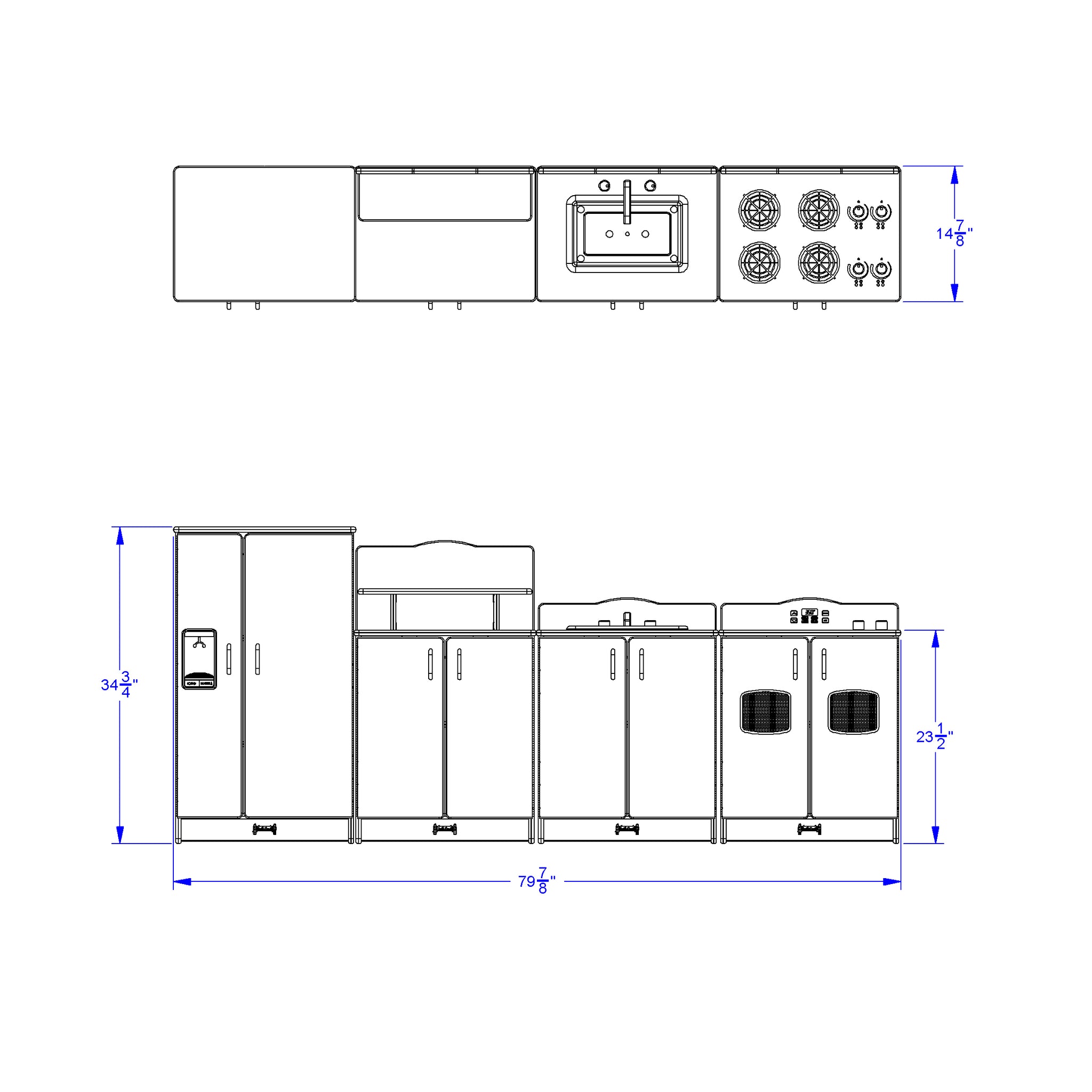 Young sous chefs will appreciate the convenience of laminate and the beauty of wood. Plenty of storage for food and dishes. Features like the four “burner” stove, “ice-maker”, wooden turn-button controls, and button display makes for realistic play. Magnetic catches help keep doors closed while chrome-looking handles and faucet provide a high-end aesthetic. Counter is 23.5" high.