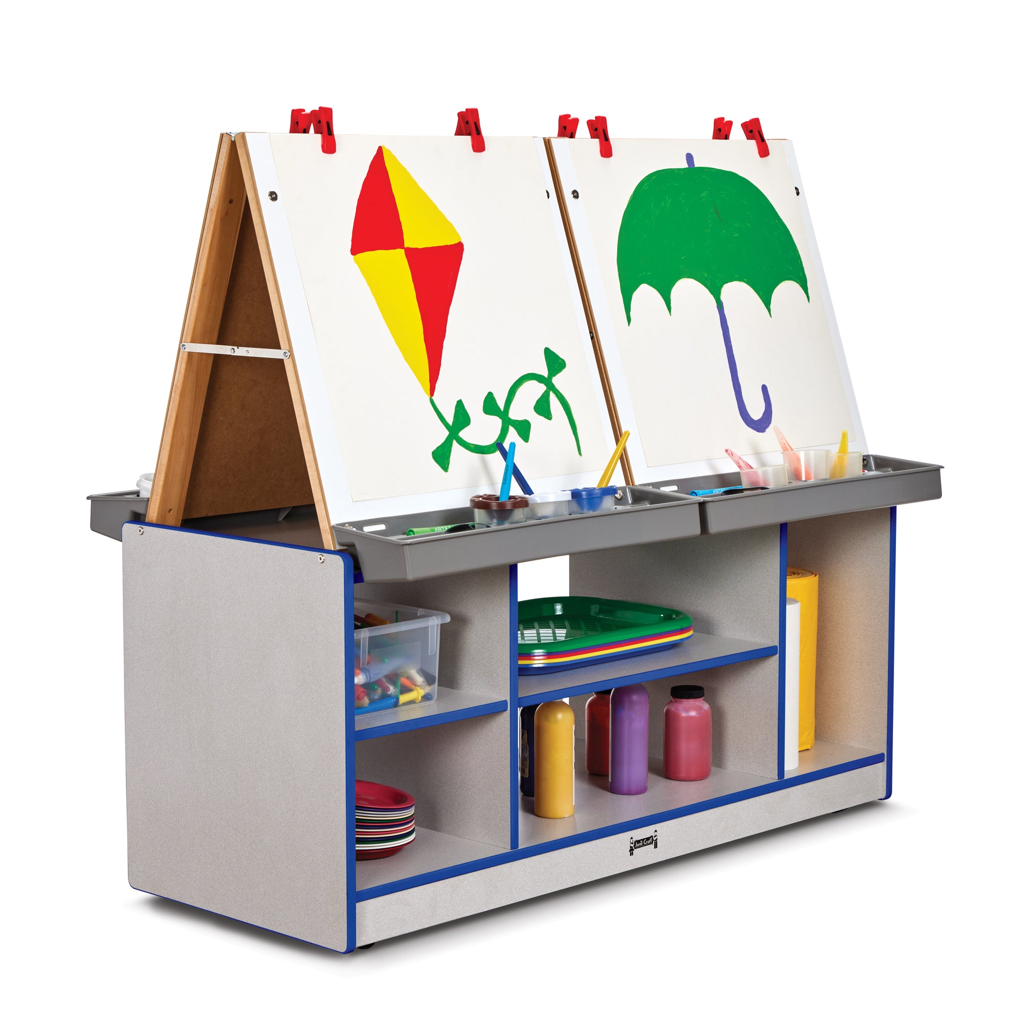Foster artist creativity and keep art supplies within children's reach. Write-n-Wipe easel panels are standard, Acrylic and Chalkboard panels are optional. Clips and paint trays included.