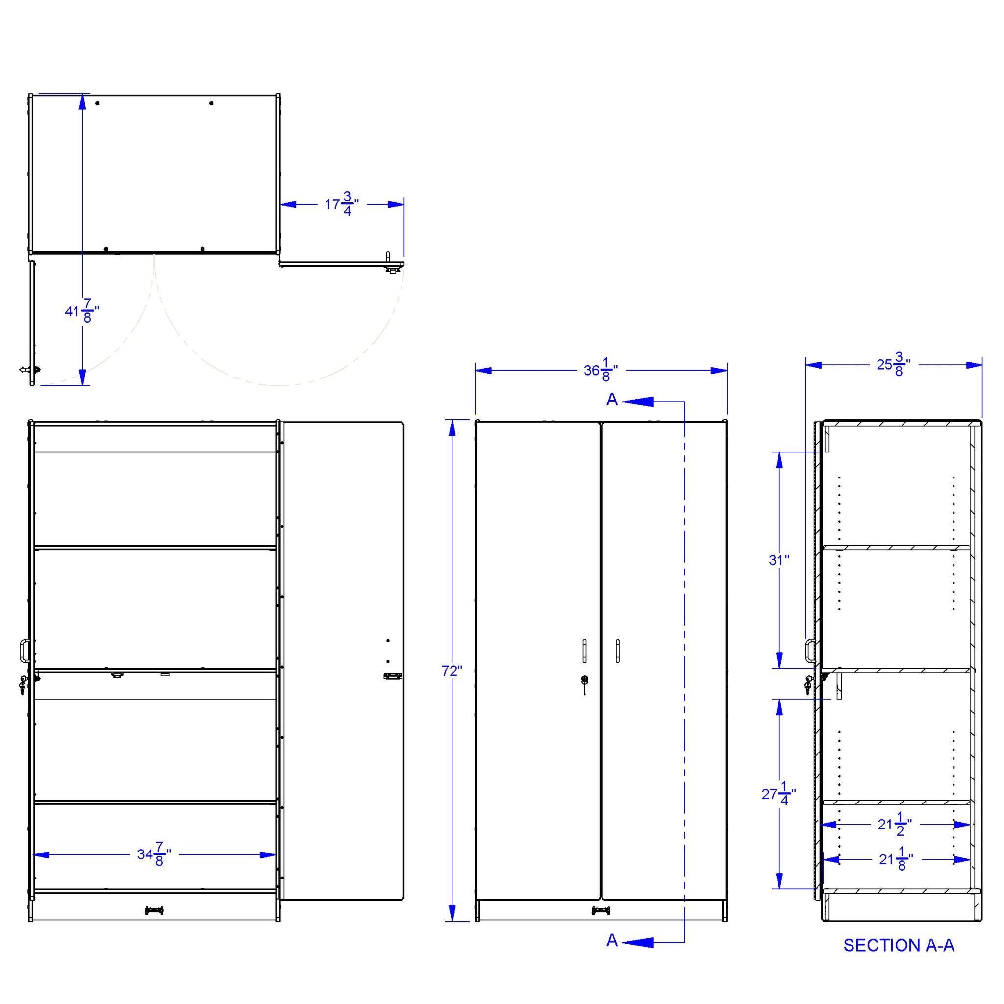 Two adjustable shelves, easily adjusted in 1.25" increments, are 35" wide x 21" deep. Lockable doors, keys included.