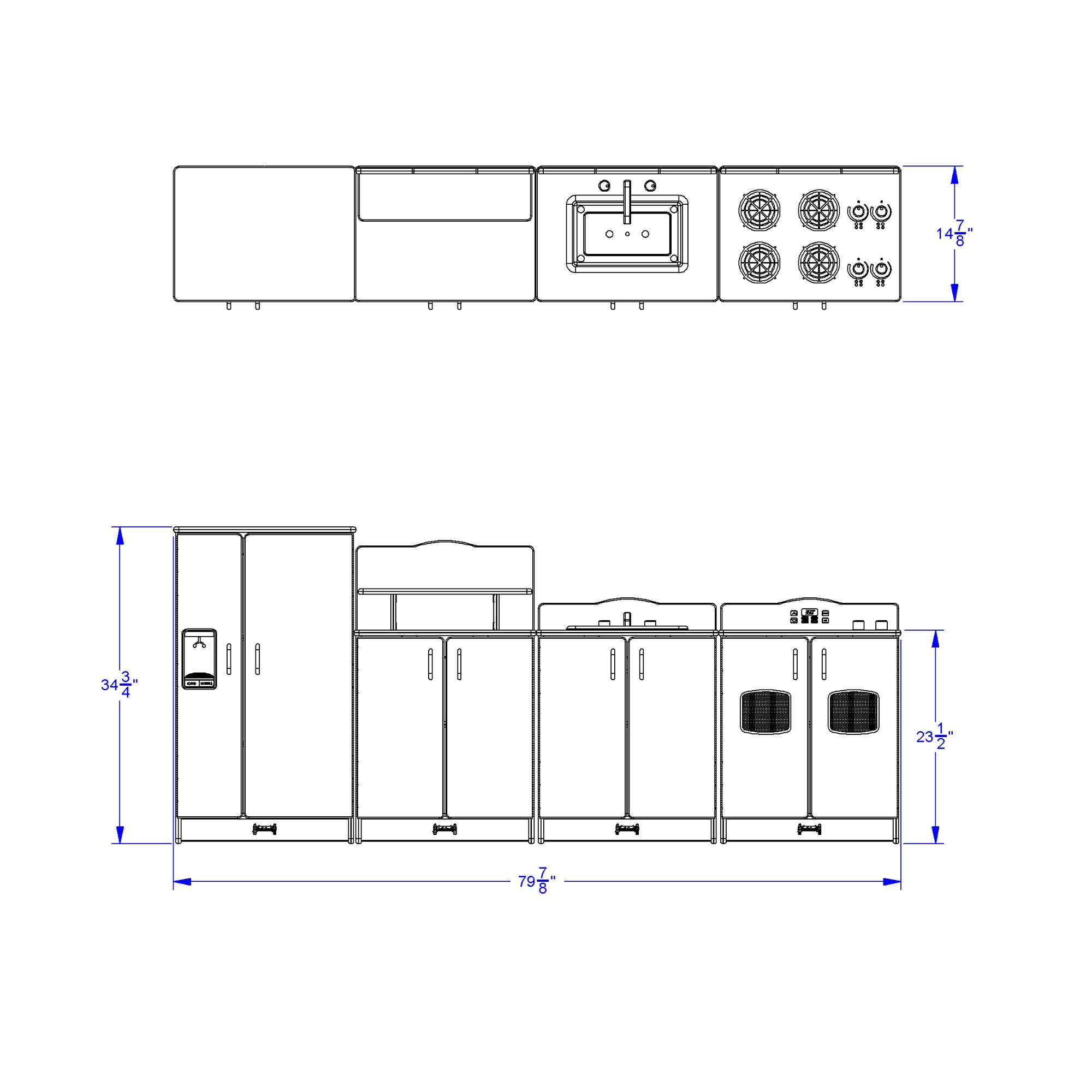 Inspire budding chefs to prepare gourmet meals with this kitchen. Magnetic catches help keep doors closed while chrome-looking handles and faucet provide a high-end aesthetic. Provides realistic play with wooden turn-button controls, “ice-maker”, and four stove “burners”. Counter is 23.5” high. Features freckled-gray laminate and navy TRUEdge®.