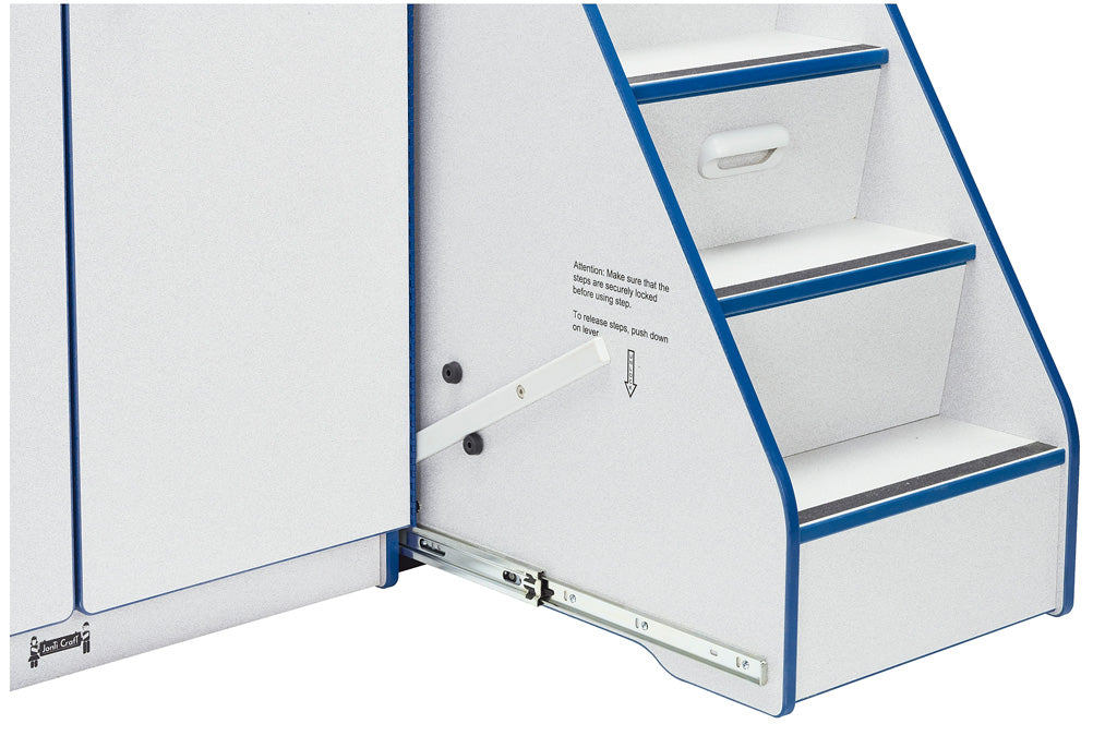 This popular changing table combo includes the Diaper Changer with Stairs and Diaper Organizer for storage above. The Diaper Changer with Stairs features a plastic top and KYDZTuff® finish provide safe surfaces that stand up to rigorous cleaning. Lockable, glide-out stairs with safety treads are located on the right side of the unit. Extra deep rails exceed recommended safety standards. E-Z to fill pull-out paper dispenser (paper not included). The included, 11 clear Cubbie-Trays can be secured behind doors with KYDZHinges® for safety. Changing pad included. Diaper Organizer features convenient wall mounted storage for diapering necessities. Mounting hardware included. Features speckled gray laminate surface with red TRUEdge®.