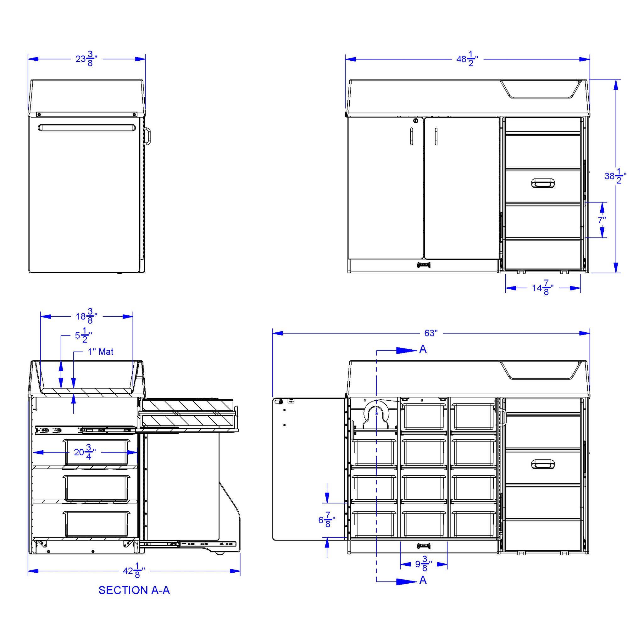 The 6.5" deep plastic top and laminate surfaces on this changing table keep little ones secure and stands up to rigorous cleaning. The lockable pull-out stairs located on the right side of the unit contain anti-slip treads for safety. Included changing pad keeps kids comfortable while changing. The included, 11 colored Cubbie-Trays make it easy to keep supplies organized and are located behind secured doors for safety. Glide-out paper dispenser (paper not included) keeps paper handy and easily accessible. Features speckled-gray laminate surface with teal TRUEdge®.