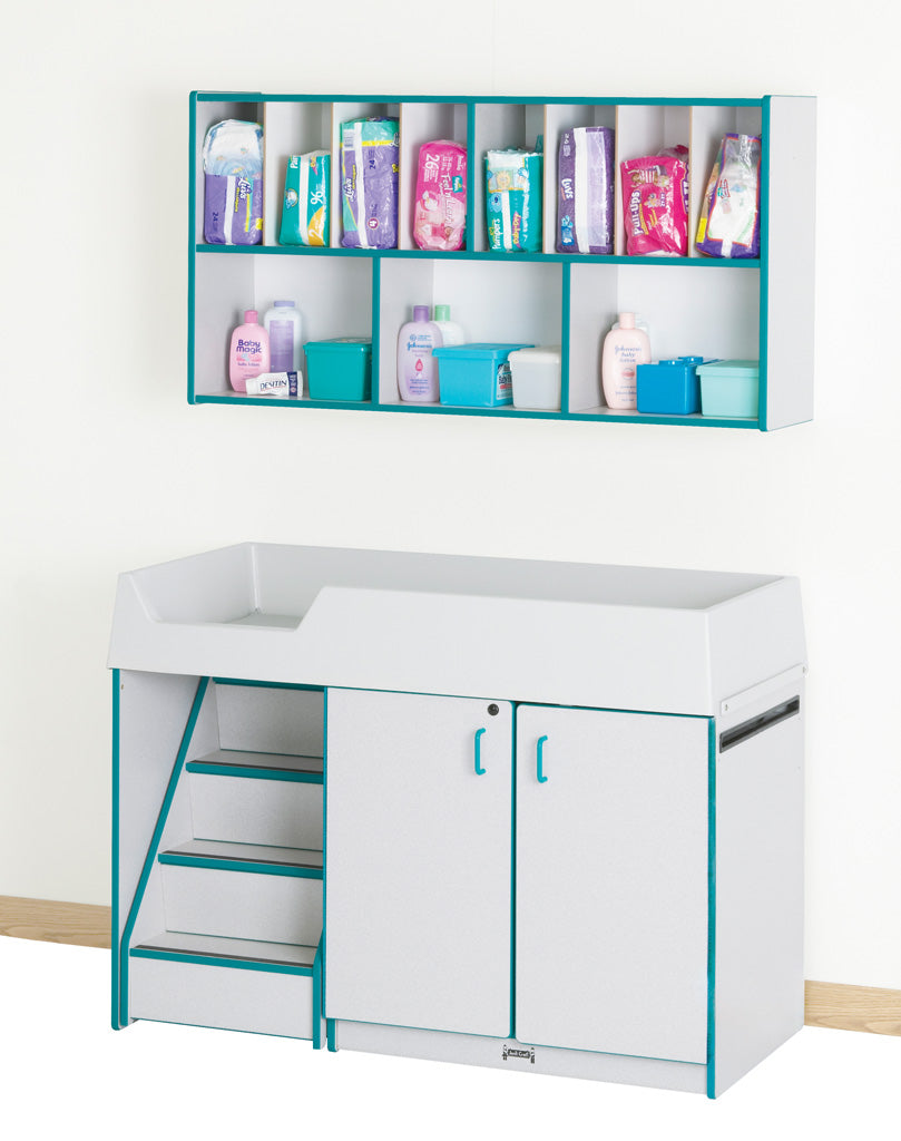 Convenient wall mounted storage with multiple sections for organizing diapering supplies. Install above changing table for a complete changing station. Mounting hardware included. Features speckled gray laminate surface with red TRUEdge®.