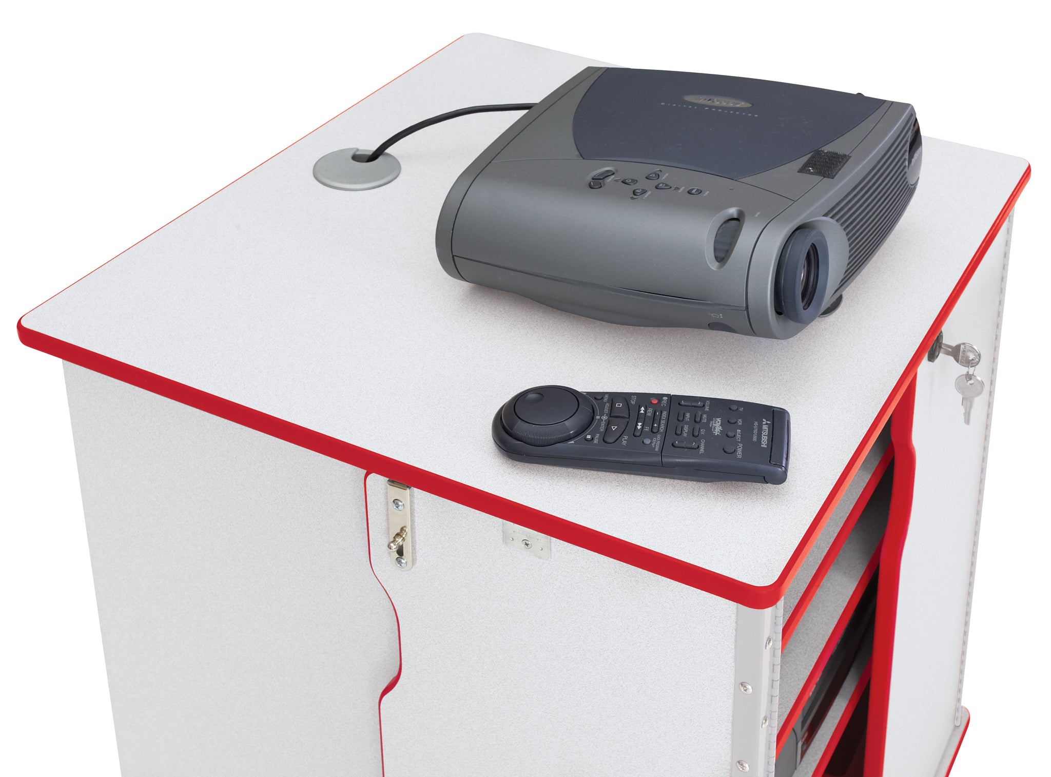 Safeguard audio/video equipment such as a projector in this locking cart. Doors can be locked open or closed. Access connection cables through removable Write-n-Wipe panel. Top and bottom grommets for cords. Three adjustable shelves. Two matching cubbie-trays and keys included. 24" wide x 23" deep x 30" high.