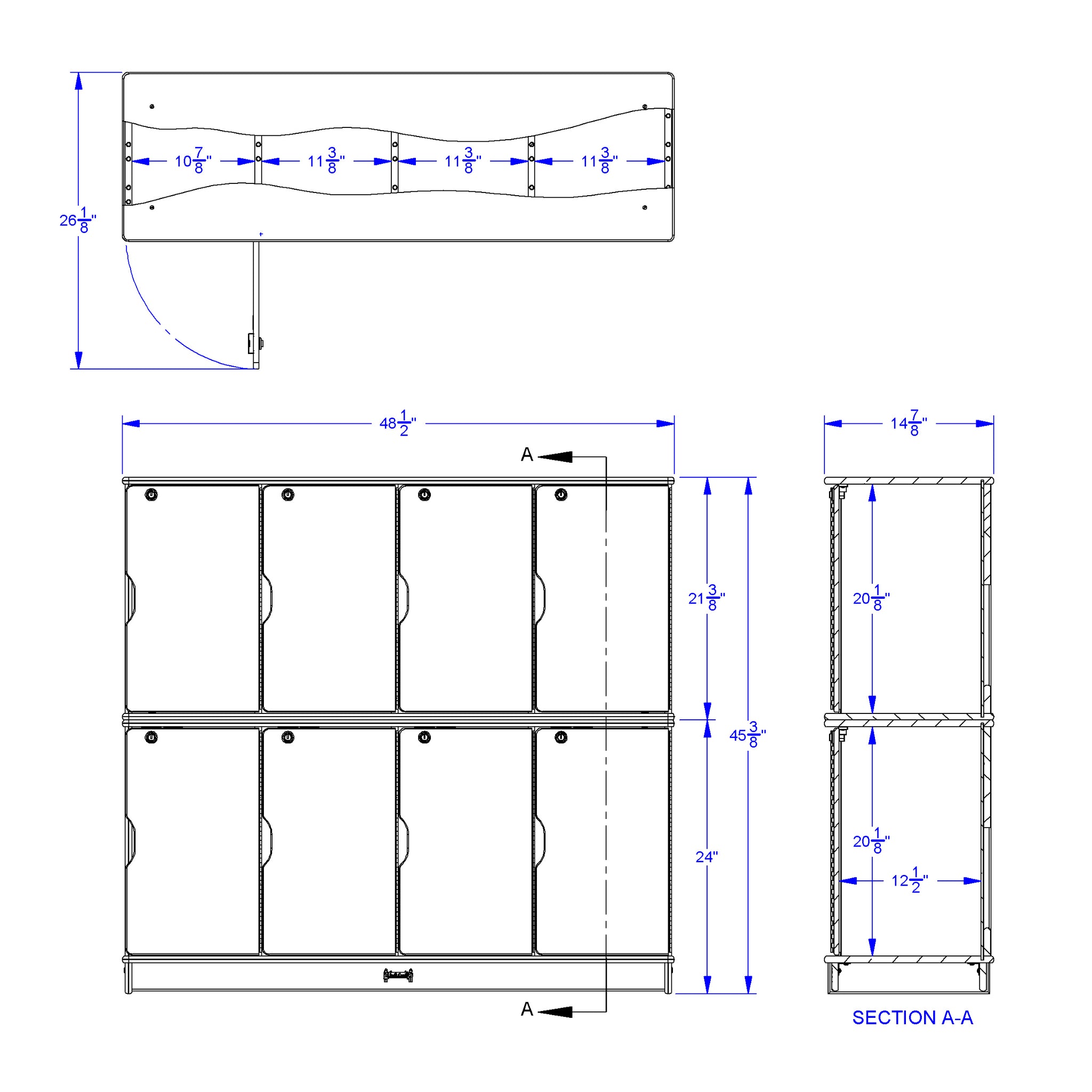 This Double stack of lockers provides space for eight kids. Different locks and keys for secured lockers. Individual lockers are 10.5" wide x 12.5" deep x 20" high. Stacked lockers must be fastened to a wall. Note: The unit has four small holes and threaded inserts through the top for stacking units.