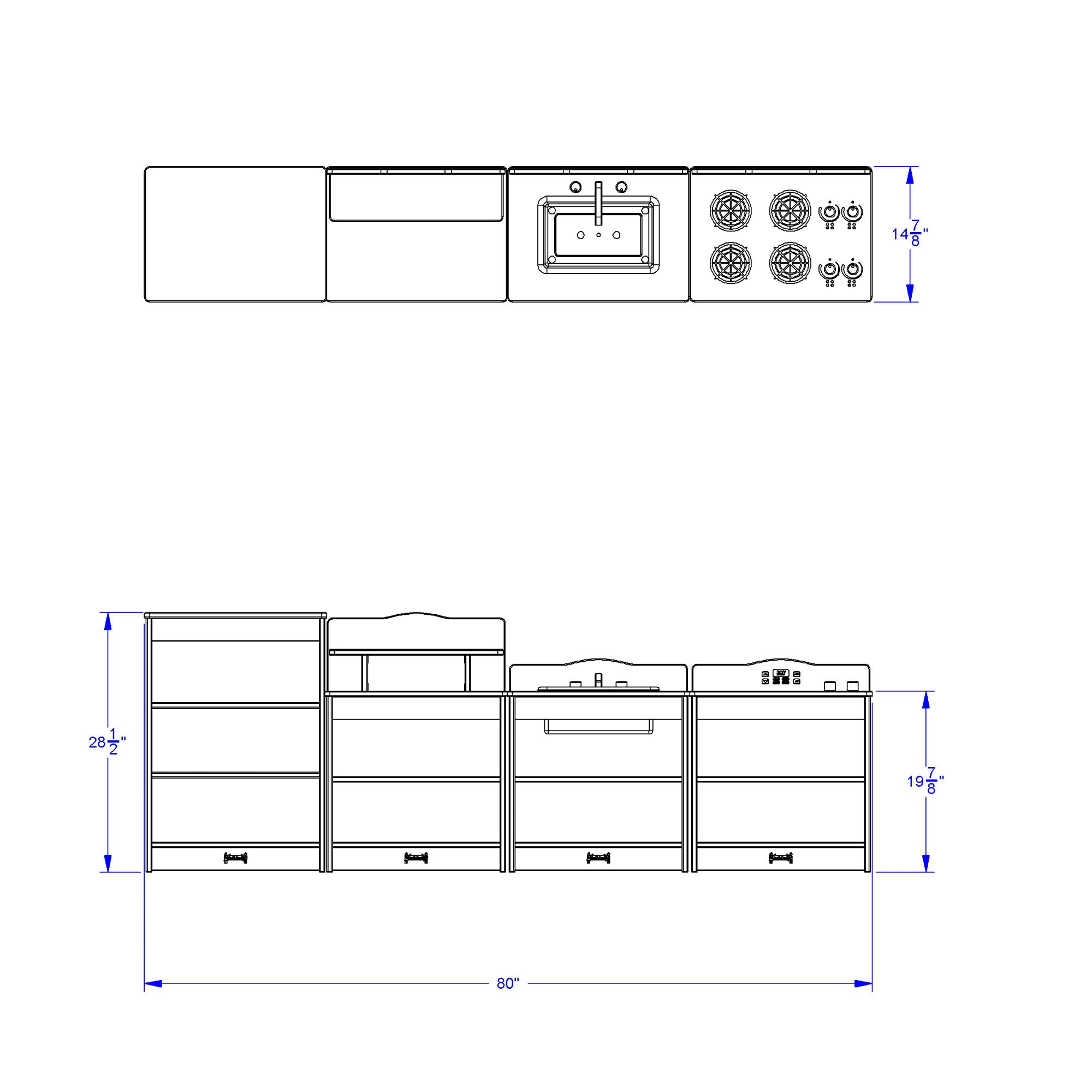 The adapted 20” counter-height of this kitchen allows curious toddlers to enjoy kitchen play. Features like the four "burner" stove, wooden turn-button controls, and button display makes for realistic play. The door-free construction provides maximum safety of little ones. Features freckled-gray laminate and navy TRUEdge®.