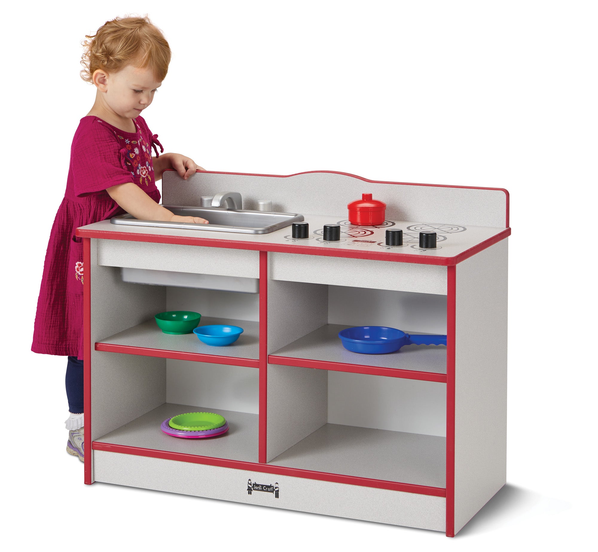 A kitchenette just the right size for toddlers. Door-free construction provides maximum safety for tots. Turnable knobs and four “burners" on the stove make for realistic play. Counter is 20” high. Freckled Gray Laminate with Orange TRUEdge® .
