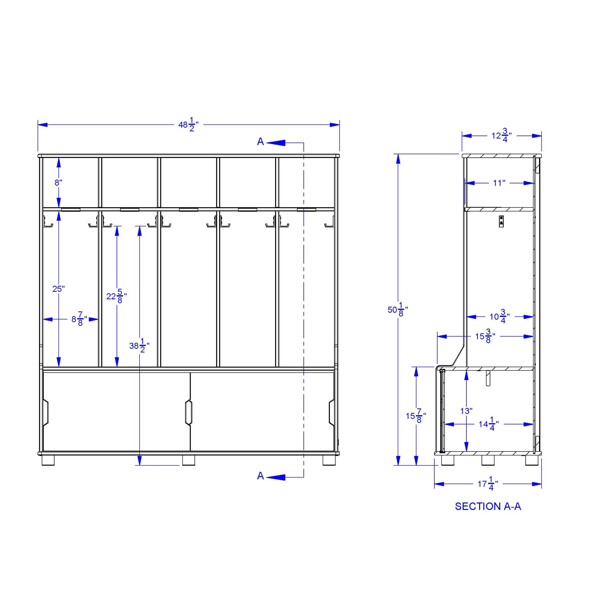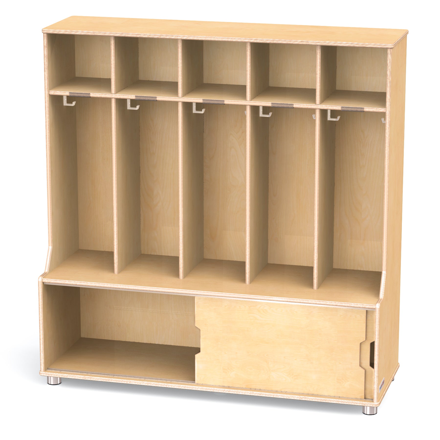 Modernistic, metal coat hook is ultra-strong and can hold heavy backpacks, coats and more. Each of the five sections includes two hooks and above cubbie space. Handy seat ledge for sitting while tying shoes or putting on boots. Lower space with two sliding doors is great for concealing larger items. Includes five name tag holders. Created by renowned modernist designer—Edgar Blazona—for a sleek, cohesive, and modern design.