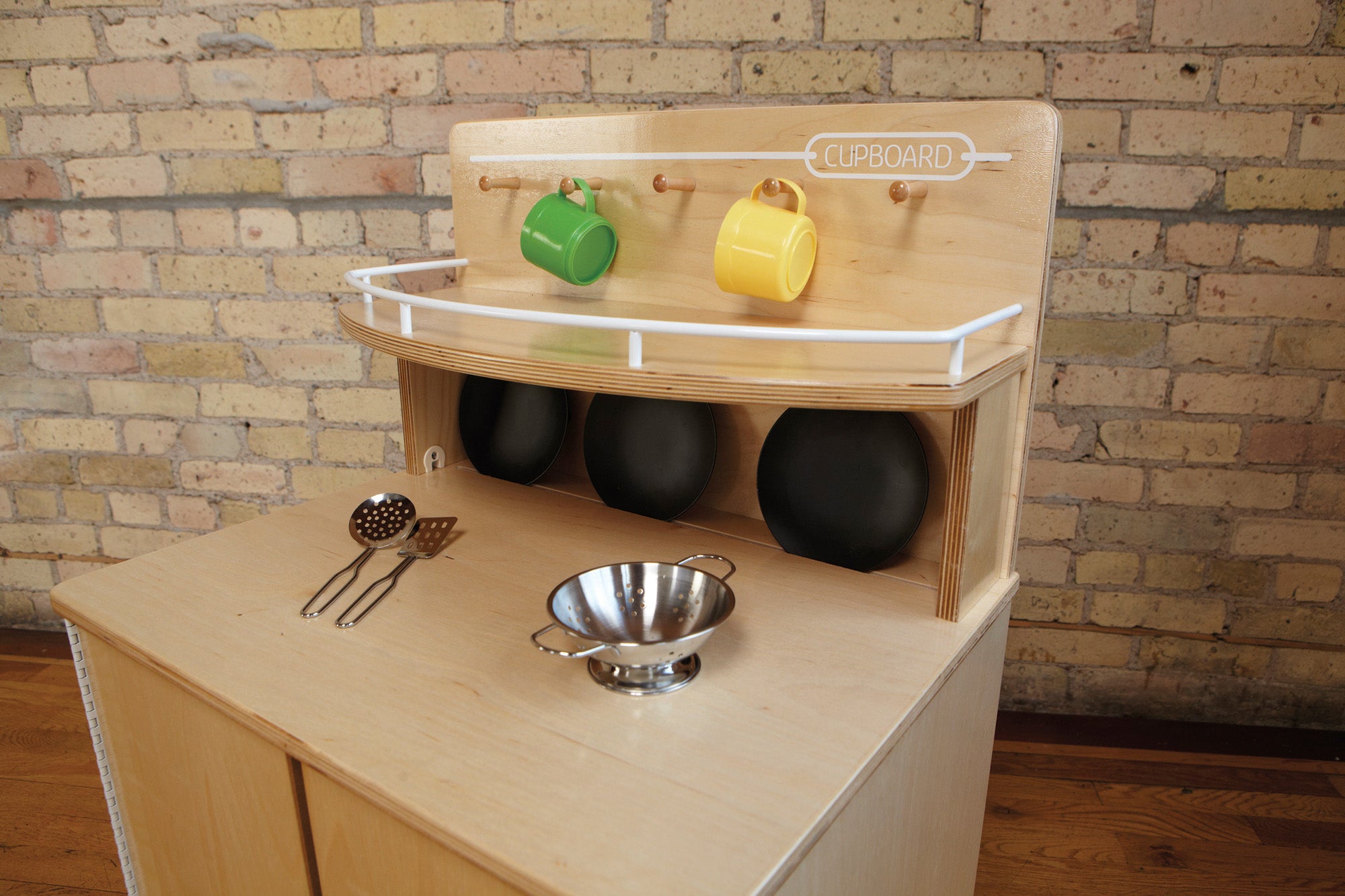 Play cupboard provides work surface for recipe creation and includes a groove for plate storage. Top shelf has five pegs for tea cups and decorative railing while two large shelves inside provide storage space. Created by renowned modernist designer—Edgar Blazona—for a sleek, cohesive, and modern design.