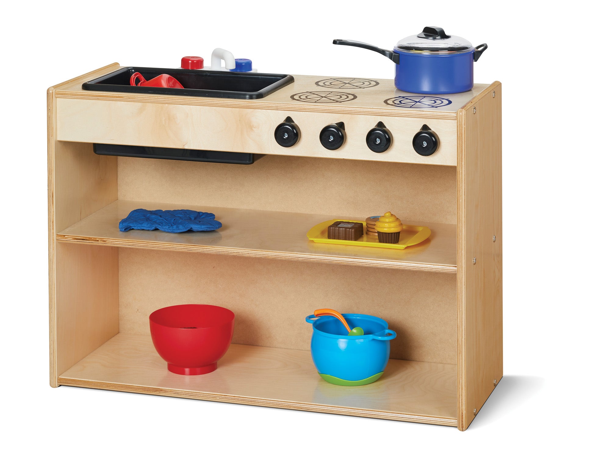 This ready-to-assemble unit gives you an affordable option for adding creative kitchen play into classrooms and other activity centers. Knobs that turn, four pretend burners, and open shelving make it a complete play center ready for young cooks.