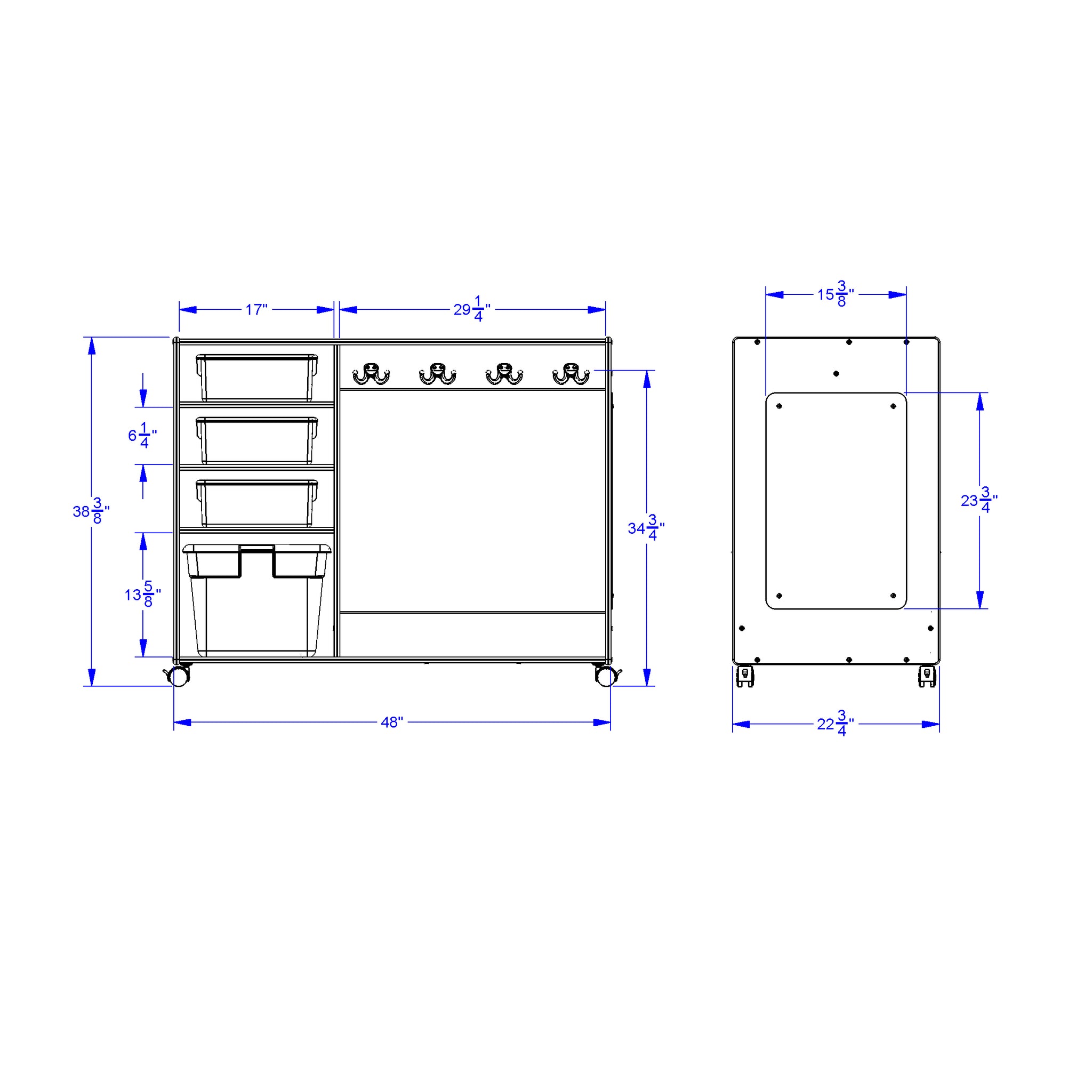 Keep costumes organized and handy with this mobile unit. Designed to hold costumes, hats, and many other pretend play accessories for even the most imaginative children! The included six clear Tubs and one clear Jumbo Tote with lid make it easy to store smaller accessories. Eight double coat hooks mean plenty of room for hanging a wide variety of costumes and dress-up items. Kids can make sure they are dressed for the part with the side-mounted, distortion-free acrylic mirror.