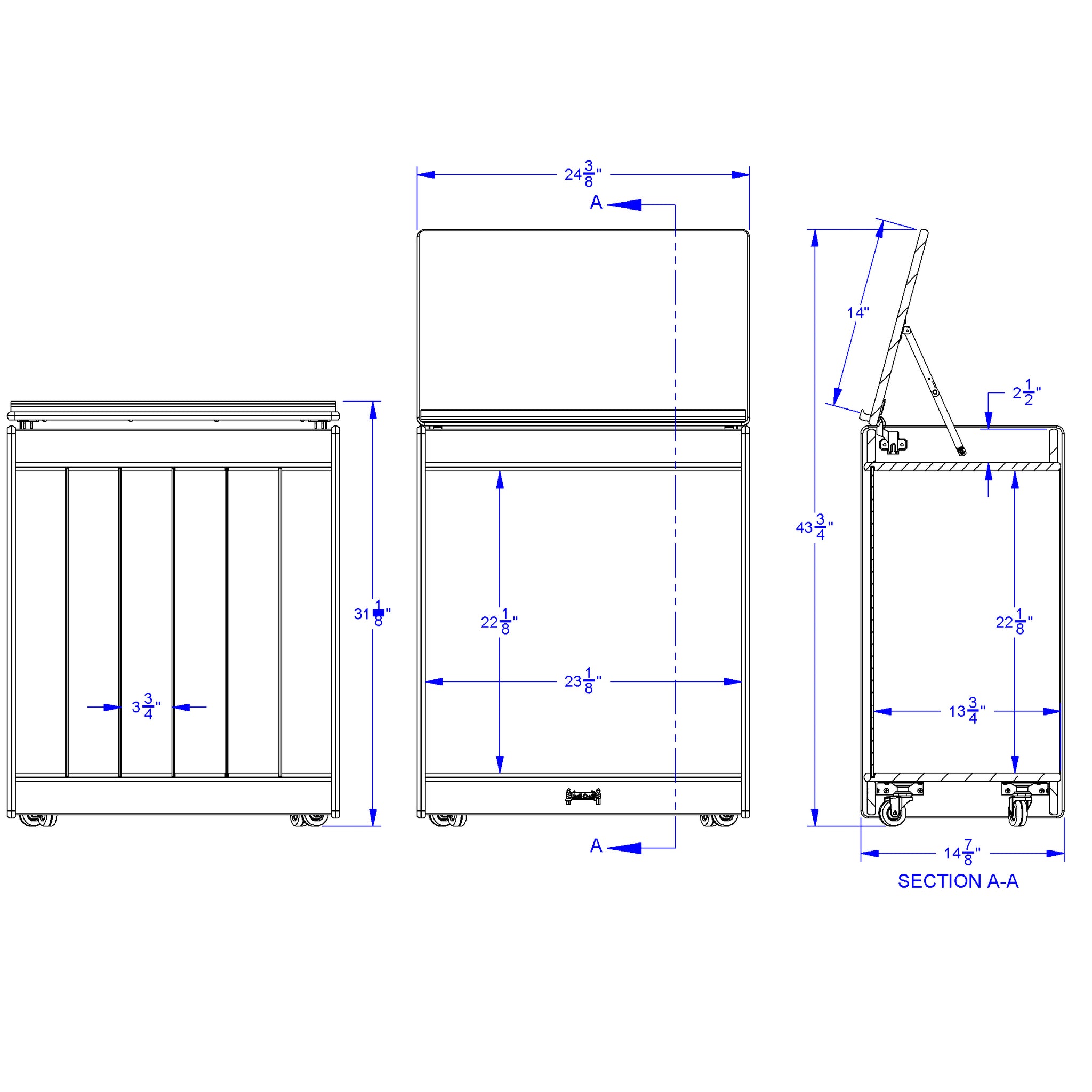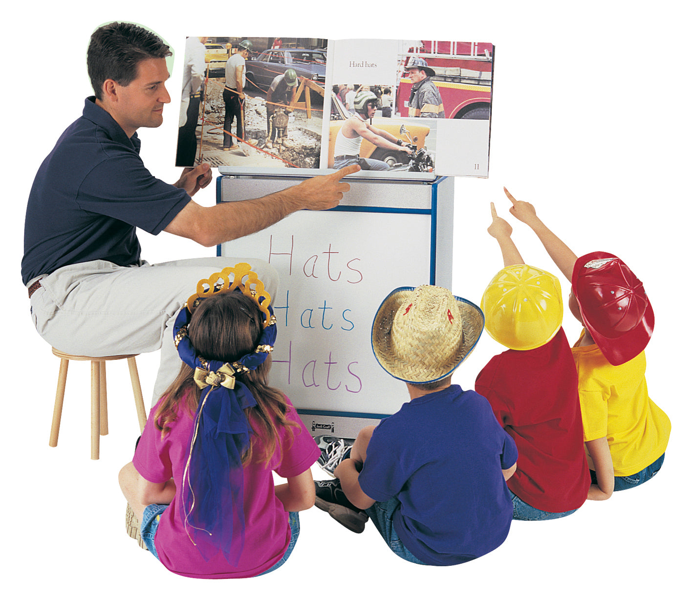 A Big Book language enrichment station on wheels! Easel folds down over storage space when not in use. Write-n-Wipe front for adding to your story. Vertical big book partitions in back for storing a multitude of books. Overall approximately 43" high.